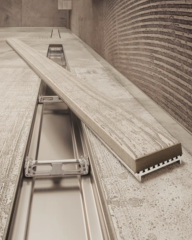 Los sistemas de desagüe también han evolucionado: marcas como Geberit, Profilpas o Dallmer ofrecen soluciones invisibles y eficientes que permiten una continuidad visual impecable.