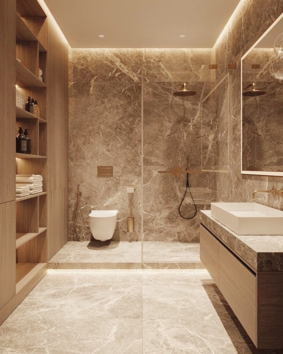 El gres porcelánico en grandes formatos —como los de Neolith, Dekton o Florim— permite crear espacios envolventes, sin juntas, con una estética limpia y contemporánea.