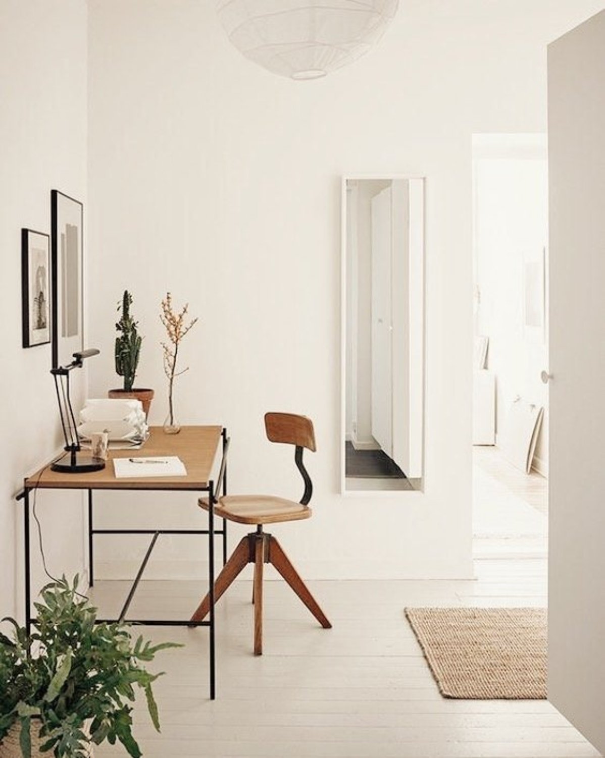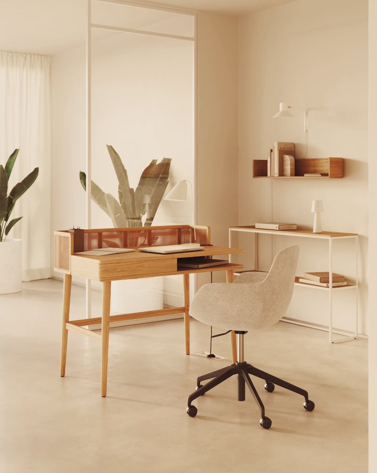 Un escritorio flotante frente al jardín transforma el trabajo en casa en una experiencia serena y productiva, con detalles decorativos que aportan calidez y estilo