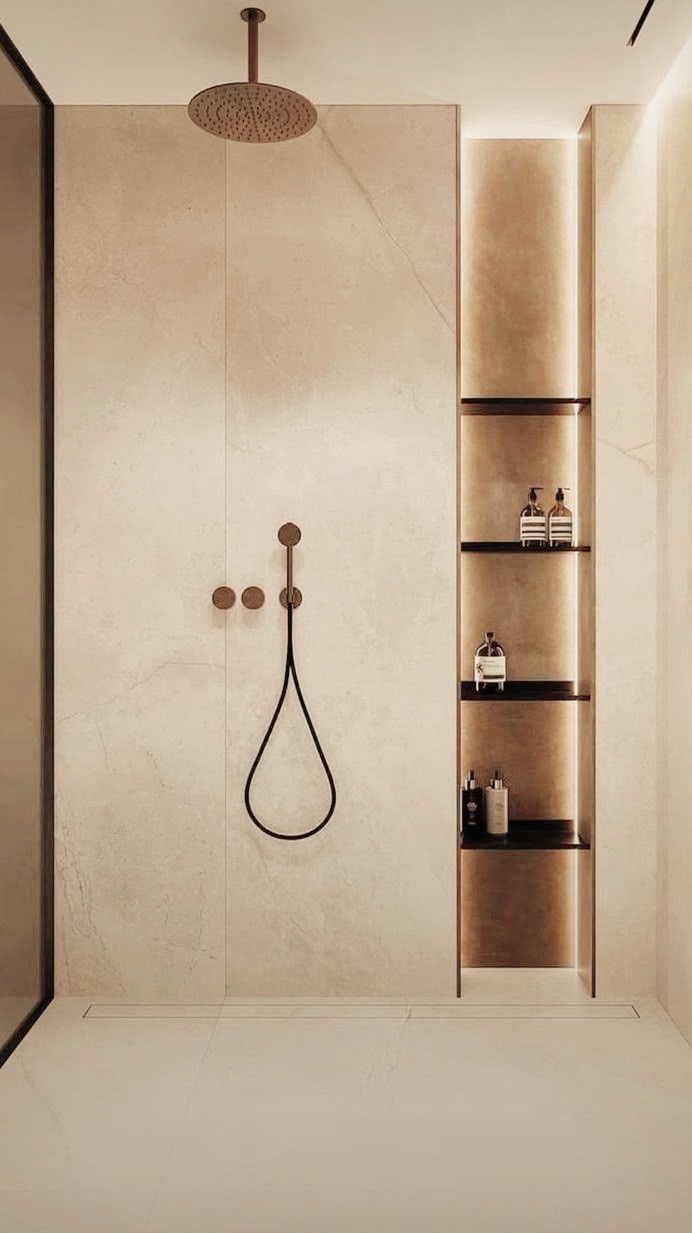Hoy, la tendencia se ha invertido: se prefieren duchas amplias, con suelo a nivel del pavimento, hornacinas integradas y materiales que aportan textura y calidez.